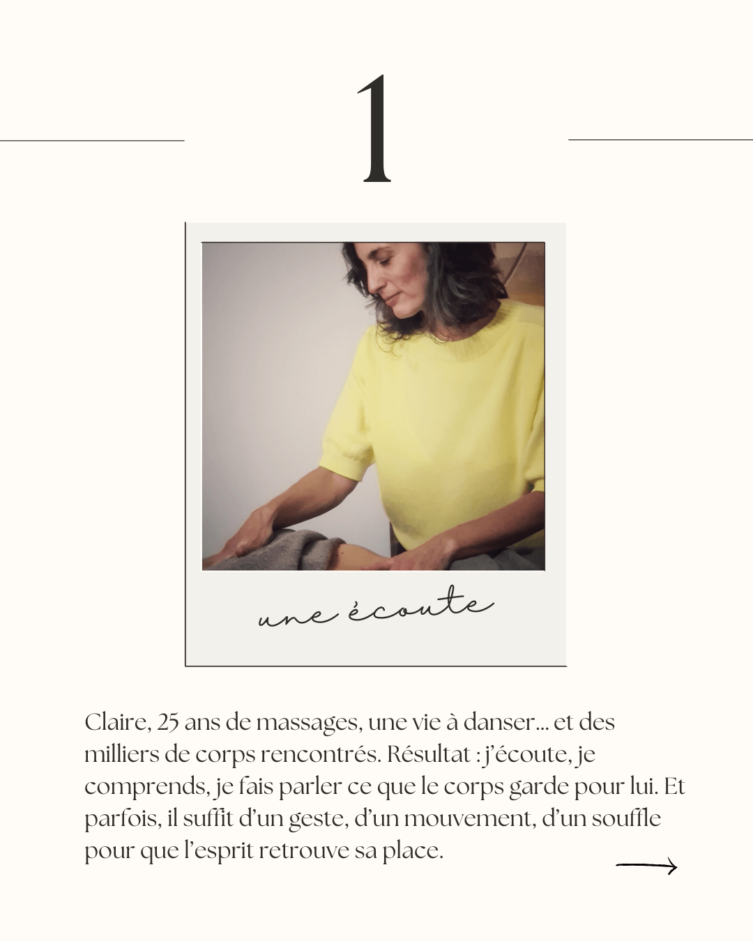 Aujourd’hui, à travers des massages sur mesure, la respiration et la danse art-thérapie, j’accompagne chacun à se reconnecter à soi, à libérer ses émotions et à remettre du mouvement dans son corps.